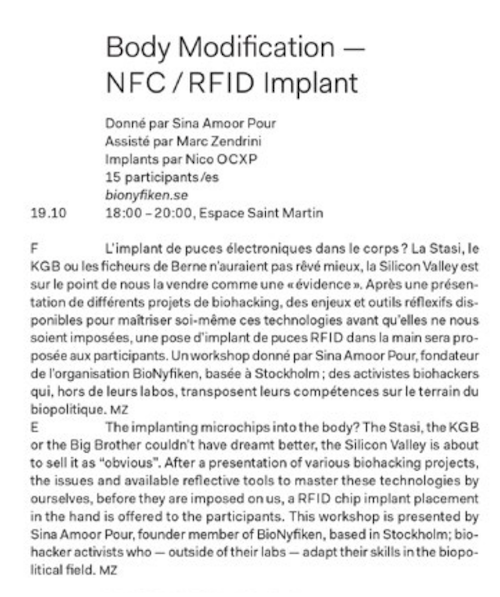 Body Modification – NFC/RFID Implant Workshop at the Lausanne Underground Film and Music Festival, with Sina Amoor Pour from BioNyfiken (SE)