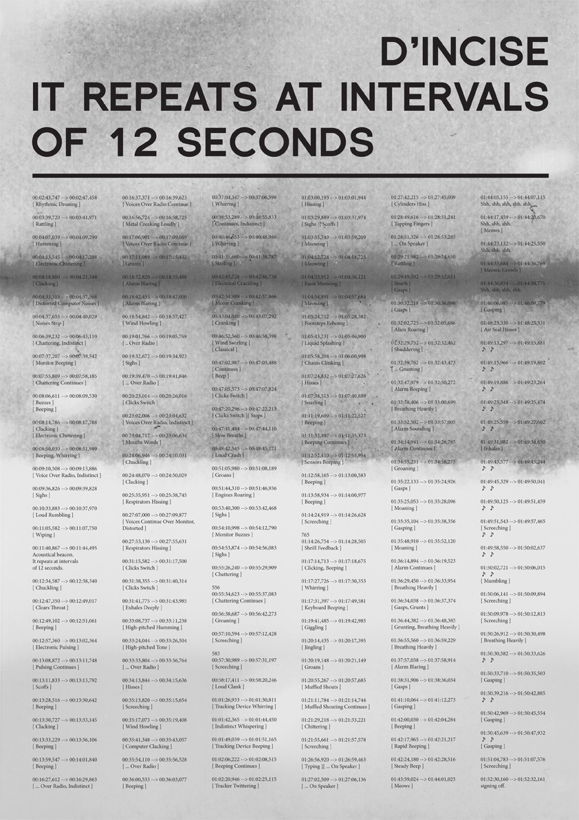 d'incise, It repeats at intervalls of 12 seconds, 2014 Composition spatialisée sur 10 haut-parleurs