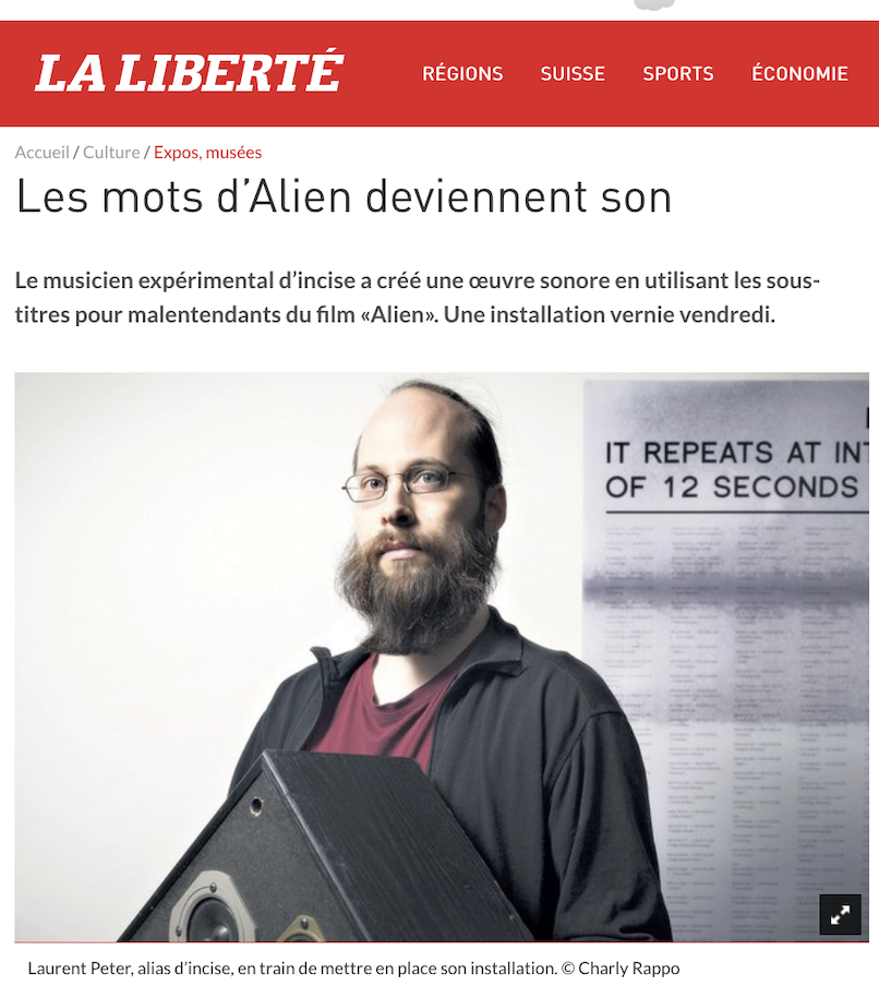 d'incise a extrait les "indications de bruit" des sous-titres pour sourds et malentendants du film Alien (Ridley Scott, USA/UK, 1979) afin de les exploiter comme une nouvelle partition. Le résultat est une pièce sonore de 1 heure et 52 minutes. Il est d'abord possible d'apprécier la composition originale réalisée par ordinateur. S'ouvre ensuite un dialogue avec les références cinématographiques plus ou moins précises de chacun.e.